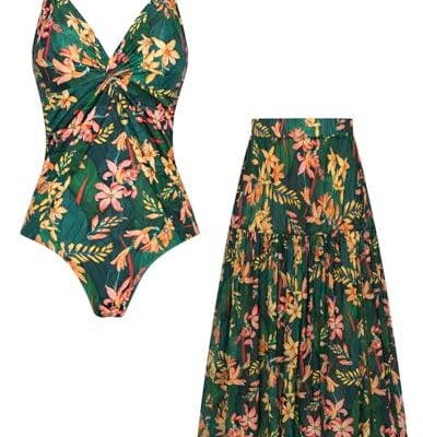 GRACE KARIN Badpak voor dames, eendelig badpak, V-hals, monokini, elegante bloemenprint, badpakjurk, zwemrokset, eendelig badpak met bedekkende rok, 2-delige set buikverstevigende badpakken,