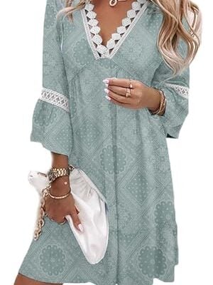 Arevill Bohemian tuniek voor dames, strandjurk, zomerjurk, vintage, strandtuniek, 3/4-mouwen, ronde hals, mini-jurk, bloemenpatroon, tuniekjurken, lichtgroen, XL