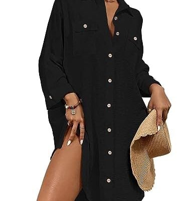 Bsubseach Badpak voor dames, cover-up bikini, korte strandjurk, casual blouse, lange mouwen, strandkleding, hemdje, sarongs, Zwart, XL