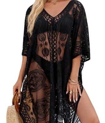 colornival Sexy elegante kanten kimono strandbedekking voor vrouwen, badpakbedekking, overgooier voor vakantie, zwembad, zee en feest, Zwart 2, M
