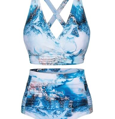 Svanco Badpakken voor dames, tweedelig, platte buik, hoge taille, sets met clips, bikiniset, push-up, V-hals, elegant, Blauw marmer, S