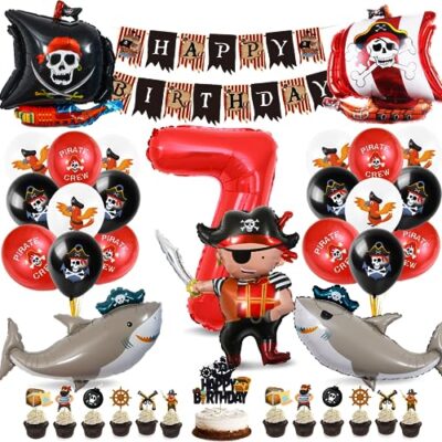 Verjaardagsdecoratieset, piratendecoratie, voor 7e verjaardag, piratendecoratie, piraat-folieballon 7, met Happy Birthday-banner en taartdecoratie voor jongens en meisjes, verjaardag, Halloween