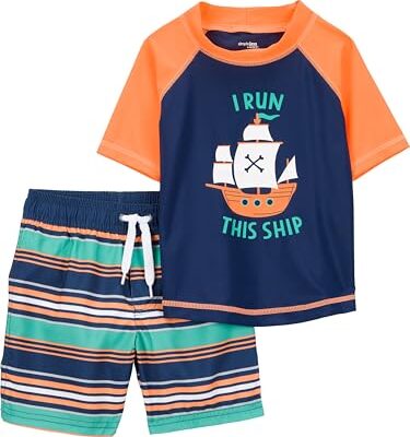 Simple Joys by Carter’s Swimsuit Trunk and Rashguard Set met huidbeschermingspak voor baby’s en jongens, Wit Strepen/Marineblauw Oranje Schepen, 3 Jaren