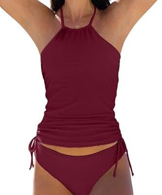 Beachsissi Tweedelig badpak voor dames, gevoerd trekkoord, zijdelingse badmode, nekhouder, luipaardprint, tankini sets, donkerrood, M