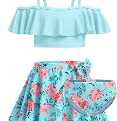 AYBUY 3-delig badpak voor meisjes, badpak voor kinderen, meisjes, met ruches, zomer, shorty, top, rok, badpak, bikini, Hawaiiaanse sportset, strand, zomer, cosplay, 140