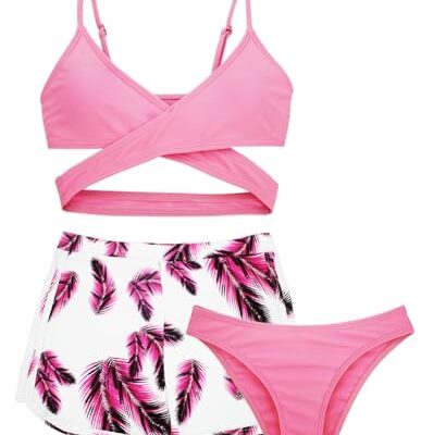 SEAUR Meisjesbikini met broek voor kinderen, 3-delig, badmode, bloemenprint, gevoerde bikini, zomer, strand, zwemmen, voor 8-14 jaar, roze, 8-9 Jaren