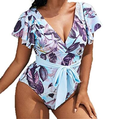 Eendelige badpakken for dames, damesbladafdrukken Eendelig badpak Diepe V-hals zwemkostuum Verstoorde badmode Bandage Tie Monokini-badpak Grote maten Tummy Control-badpak Retro Vintage Swi (Color : B