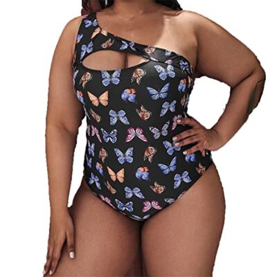 Eendelige badpakken for dames, vlinderprints for dames Eendelig badpak Een schouderuitsparing Zwemkostuum Tummy Control Monokini-badpak Grote maten Tummy Control-badpak Retro Vintage Swi (Color : Bla