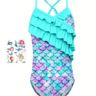 Badpak voor meisjes, zeemeerminnenbadpak voor kinderen, eendelig, strandbadpak, sneldrogend, badpak voor meisjes, tijdelijke zeemeermin-tatoeages, Groen, 110 cm