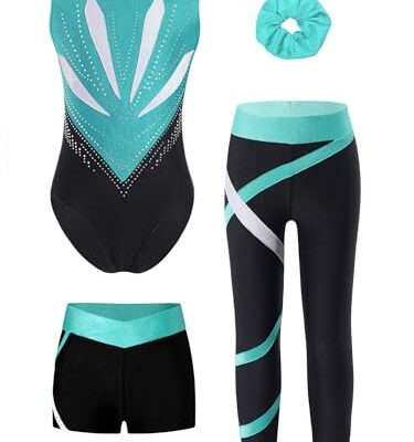 inhzoy Turnpakje, voor meisjes, met korte en lange broek, mouwloos, colour blocking, set met tricot, leggings, shorts en haarelastiekjes, gymnastiekset, danskleding, blauw en groen., 146-152