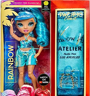 Rainbow High Pacific Coast – HALI CAPRI – Blauwe fashion pop met outfit, verwisselbare benen en een displaystandaard – Bevat een handdoek, draagtas & meer – Gift & verzamelbaar – 6+ jaar