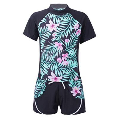 JEATHA Meisjes UV-bescherming badpak 2-delig strandkleding badmode bloemenprint korte mouwen zwemshirts zwemshorts zomer zwempak surfpak maat 98-152, groen, 134-140