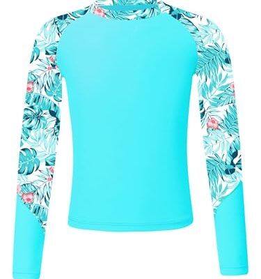 Kaerm Rash Guard Shirt voor kinderen, meisjes, lange mouwen, Hawaïmotief, zwemshirt, sneldrogend, surfshirt, neopreen, ronde hals, zwemshirt, bovendeel, zwemkleding, blauwgroen A, 146-152