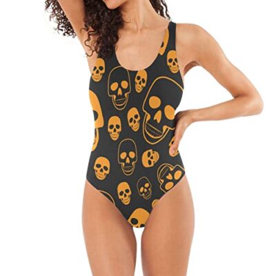 RPLIFE Zeeblauw patroon met dolfijnen zwempakken voor dames, sexy badpak voor vrouwen, buikcontrole, korset badpak, Schedel patroon op zwart, S
