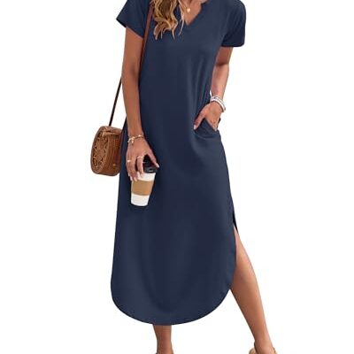 AUSELILY Ongedwongen maxi-jurk voor dames, voor in de zomer, met korte mouwen, V-hals, losvallende zomerjurk, split, lange strandjurk, shirtjurk voor op vakantie, Donkerblauw, M