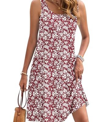 AUSELILY Zomerjurk voor dames, mouwloze midi-jurk, casual strandjurk, lichte swing, tankjurk met zakken, Nieuw bloemenrood, L
