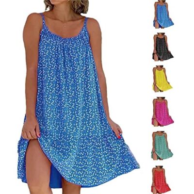 Hemdjurk met bloemenprint, zomerjurk met spaghettibandjes for dames, casual tankjurk met spaghettibandjes, zomerjurken for strandjurken met losvallende pasvorm for dames (Color : Blue, Size : L)