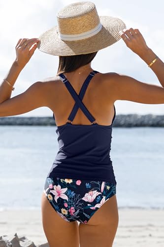 Beachsissi Tankini sets voor dames, schattige bloemenprint, V-hals en buikcontrole, tankini-sets, Donkerblauw, M