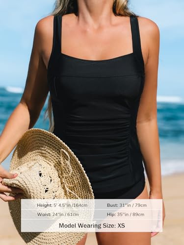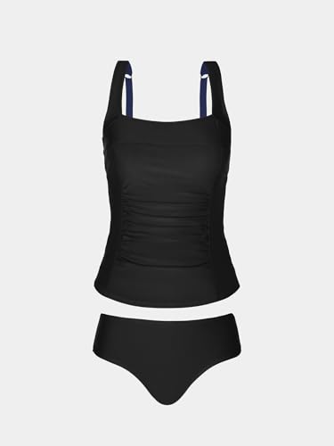 Design: de zwarte tankinisets voor dames hebben een vierkante hals en verstelbare bandjes. Details met ruches aan de voorkant zijn voor buikcontrole, de uitsparing aan de achterkant en haaksluiting zorgen voor een unieke touch.