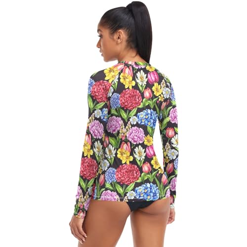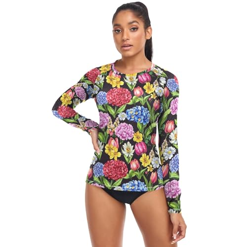 Dames Rash Guard Shirts Zonbescherming Kleding UPF 50+ Lange Mouw Zwemshirts Badpakken, Kleurrijke heldere bloemen, M