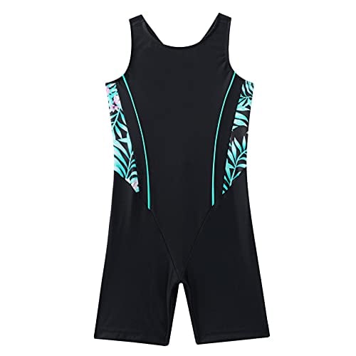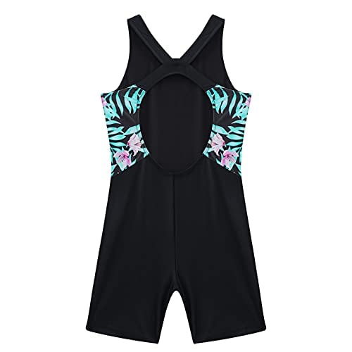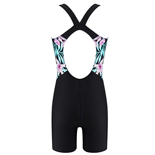 dPois Badpak voor meisjes met pijpen, mouwloos, eendelig, badmode, zwempak met racerback, sportieve kinderbadkleding, bloemen en zwart, 146-152