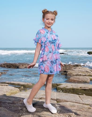 [Kenmerken]: dit is een strandjurk voor kinderen met ronde hals en ruches op de kraag; vleermuismouwen uit één stuk verbonden met de taille, ruches aan de randen van de manchetten en zijnaden van de rok; rafelen bij de hals en taille. plooien, voorzien van elastiek