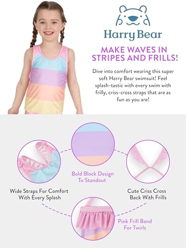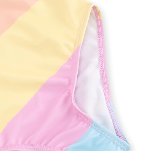 Zoet Zomers Gestreept Zwempak: Het gestreepte zwempak voor meisjes heeft prachtige pastel regenboogstrepen in roze, blauw, paars, oranje en geel, wat elke zwemdag verandert in een spetterend, kleurrijk avontuur