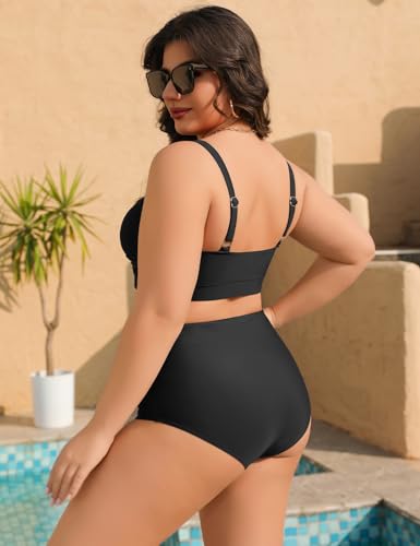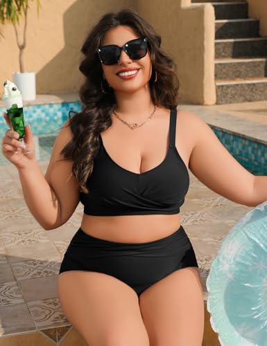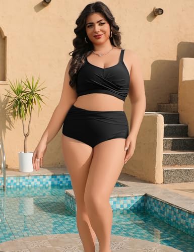 heekpek Dames zwemkleding plus size V-hals buikcontrole badpak 2-delig twist front hoge taille bikini set plus size badmode, Zwart, L