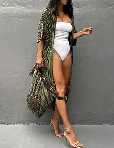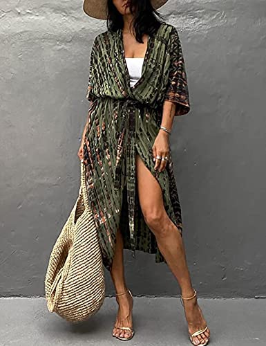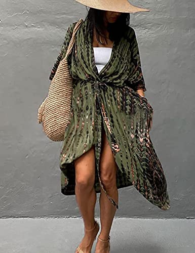 HYUET Maxi-strandjurk voor dames, bikini-cover-up, oversized strandponcho, lange boho-kimono, losse zomerpareo, lange zomerjurk, elegante maxi-jurk, katoen, voor op vakantie, A-legergroen., Eén maat