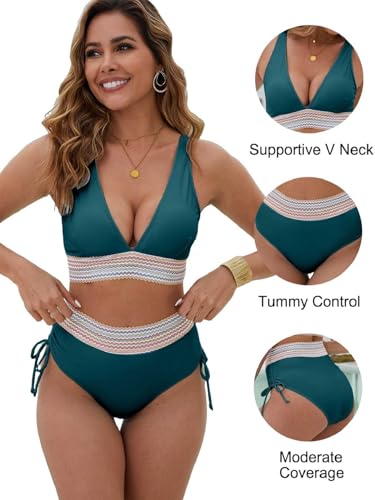 Joligiao Color Block 2-delige badpakken dames hoog getailleerde bikinisets push-up gewatteerde bikinitop en buikcontrole badmode bikinibroekje met trekkoord zomer badpakken zacht zwemkostuum, Pauw