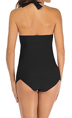 De voorkant van de haltertankini set heeft plooien en rug van de tankini is rugvrij. Vanwege de nekhouder en het gevoerde design ziet de badmode er sexy maar buikweg uit.
