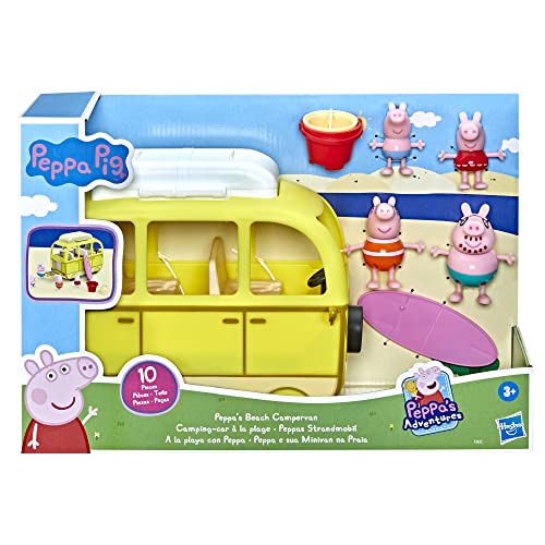 OP VAKANTIE MET PEPPA’S STRANDCAMPER! Dit speelgoedbusje voor peuters zit vol knor-tastisch speelplezier! Het dak kan open en heeft een drager om de surfplank van het gezin mee te nemen