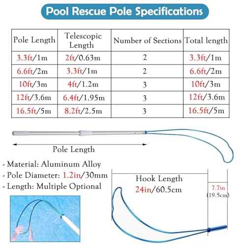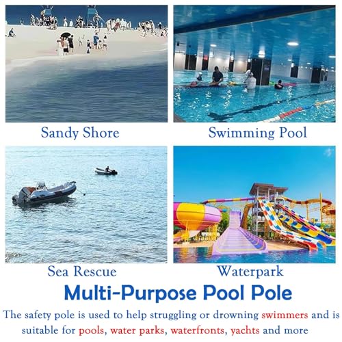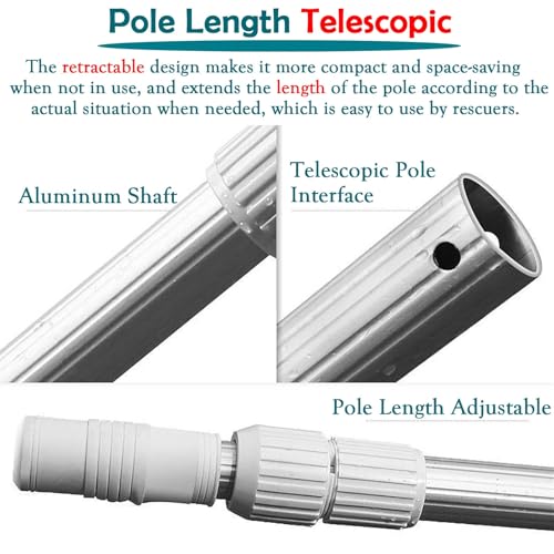 Materiaal: levensreddende aluminium telescoopstang voor zwembaden: gemaakt van een hoogwaardige aluminiumlegering, biedt deze reddingsstang voor zwembad robuustheid, duurzaam gebruik en oxidatiebestendigheid, waardoor hij geschikt is voor zwembaden en zeeomstandigheden.