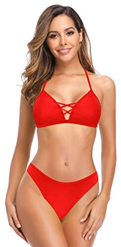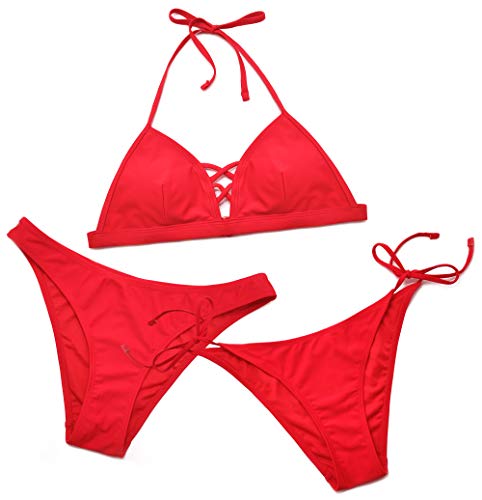 SHEKINI Dames Driedelig Zwemkleding Cross Cutout Halter Verstelbaar Bikinitop met Triangel Lage taille Bikinibroek en…