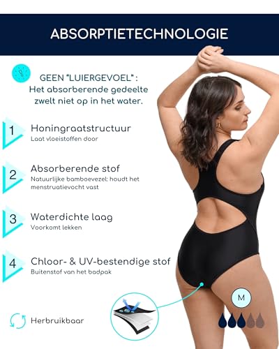 INNOVATIEVE ABSORBERENDE TECHNOLOGIE : het menstruatie badpak vangt de menstruatiestroom op, zelfs in het water. Zwelt niet op en geen “luiergevoel”. Comfort gegarandeerd, zowel in als buiten het water.