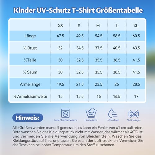 Robuust en onderhoudsvriendelijk zonwerend shirt voor kinderen: dankzij de hoogwaardige materialen is het shirt duurzaam, gemakkelijk te wassen en sneldrogend – perfect voor dagelijks gebruik in de lente, zomer en herfst.