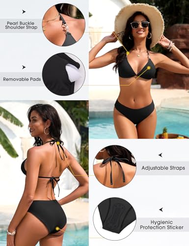 Klassieke driehoekige bikini met comfortabele vulling: deze bikinisets hebben een klassiek driehoekontwerp met fijne schouderbandjes en zachte, uitneembare vulling voor individueel aanpasbare ondersteuning en comfort. Het borstgedeelte is versierd met een pareldesign, dat een elegante touch toevoegt.