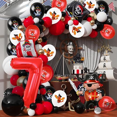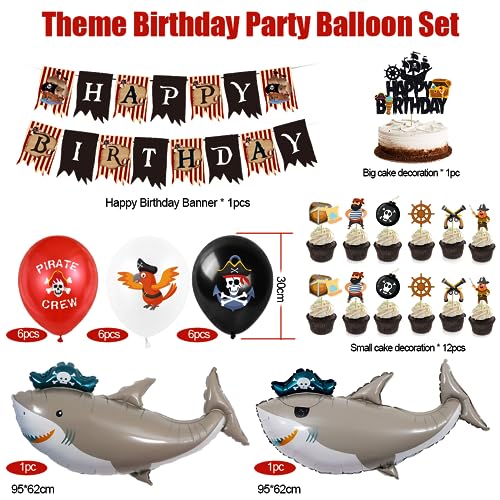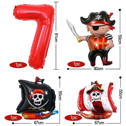Piraten verjaardagsdecoratieset: de set bevat 1 x piratenbanner “Happy Birthday”, 1 x 81 cm rode cijferballon “7”, 5 stuks folieballonnen (piratenman x 1, 2 x piratenschip, 2 x piratenhaai), 18 stuks bedrukte ballonnen (6 rood, 6 x wit, 6 x zwart, 6), 13 stuks taartdecoratie (1 groot + 12 klein). Voldoende diversiteit en hoeveelheid om aan je behoeften voor feestdecoratie te voldoen
