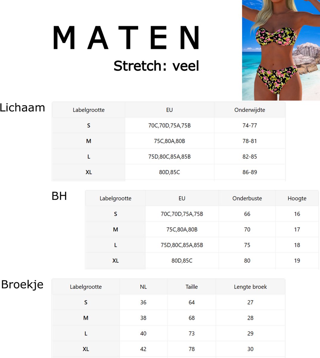 Dit model is vooral geschikt als je een strapless bikini met bloemenprint zoekt. Let goed op de maattabel bij de foto’s, want de juiste pasvorm hangt af van je boven- en ondermaat. Wil je veel steun of verstelbare bandjes, dan past een ander model mogelijk beter.