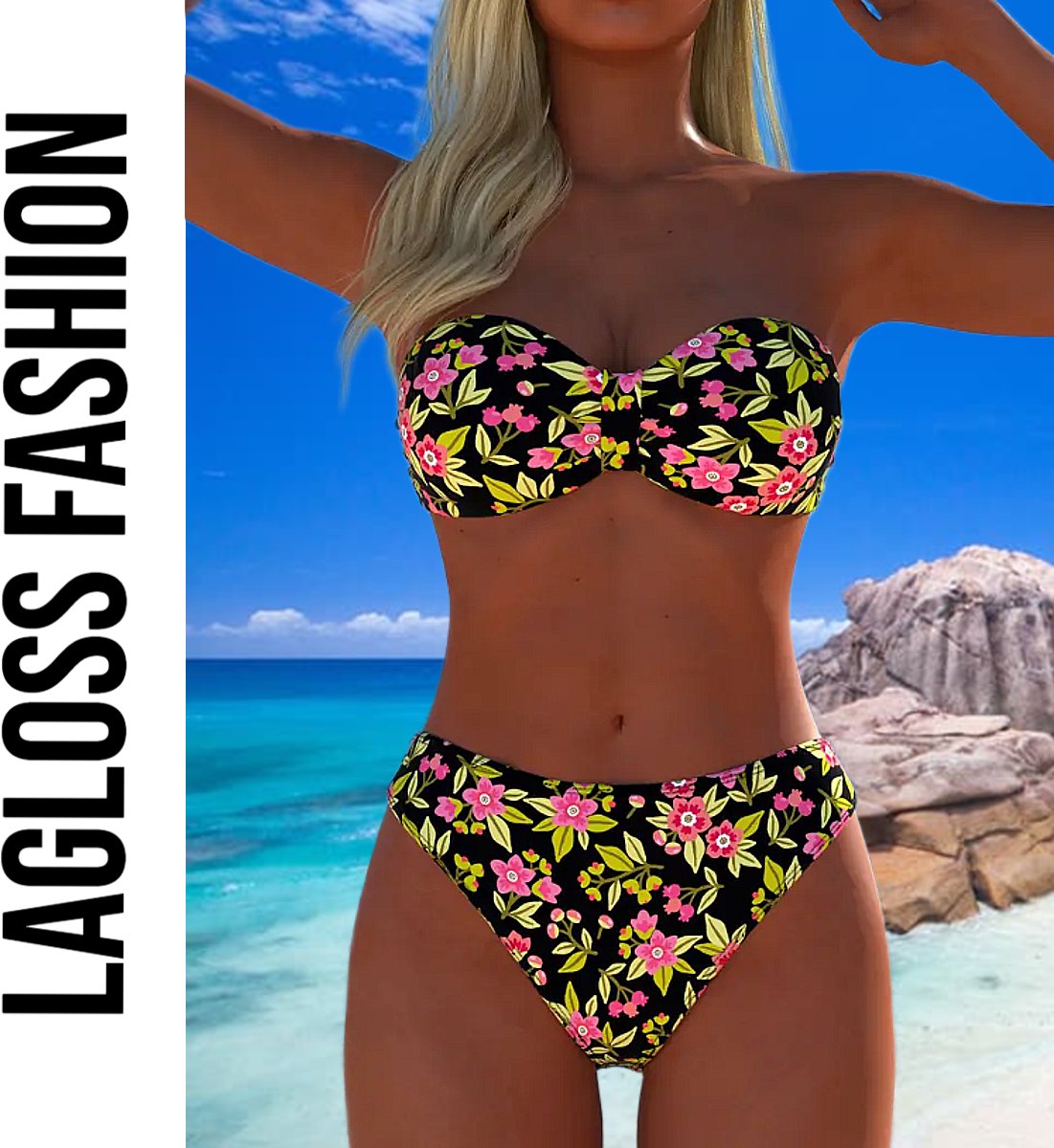 Deze bikini van LaGloss® is bedoeld voor dames die een moderne strandlook zoeken. De set bestaat uit een strapless top en een bijpassend broekje met bloemenprint, handig voor zon, zwembad en vakantie.