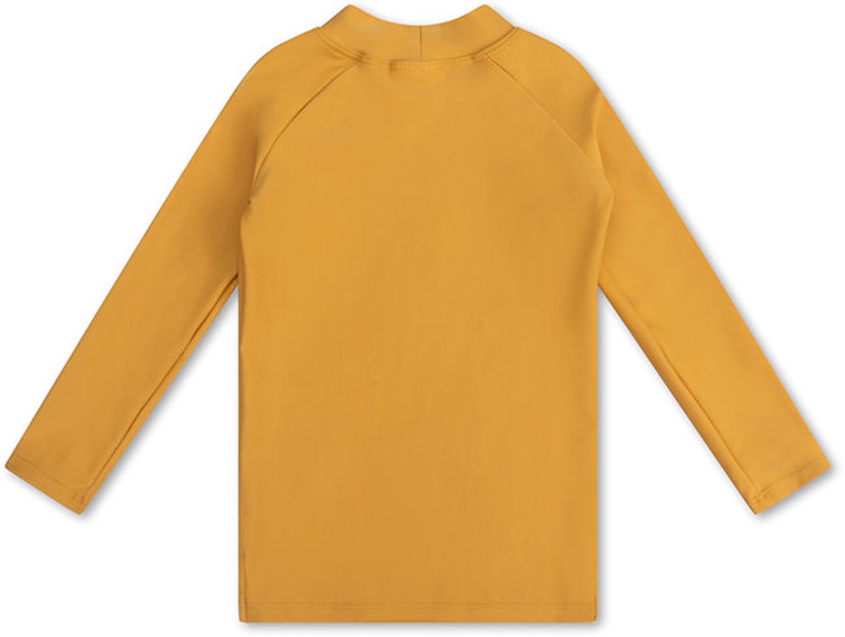 Volgens de beschrijving is het shirt gemaakt van zachte, rekbare gerecyclede stof. Die stof is ademend en sneldrogend, wat handig is voor zwemmen en spelen. Was het bij voorkeur volgens het waslabel, zodat de elasticiteit en UV-bescherming langer goed blijven.